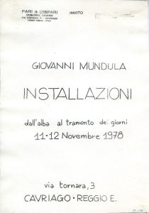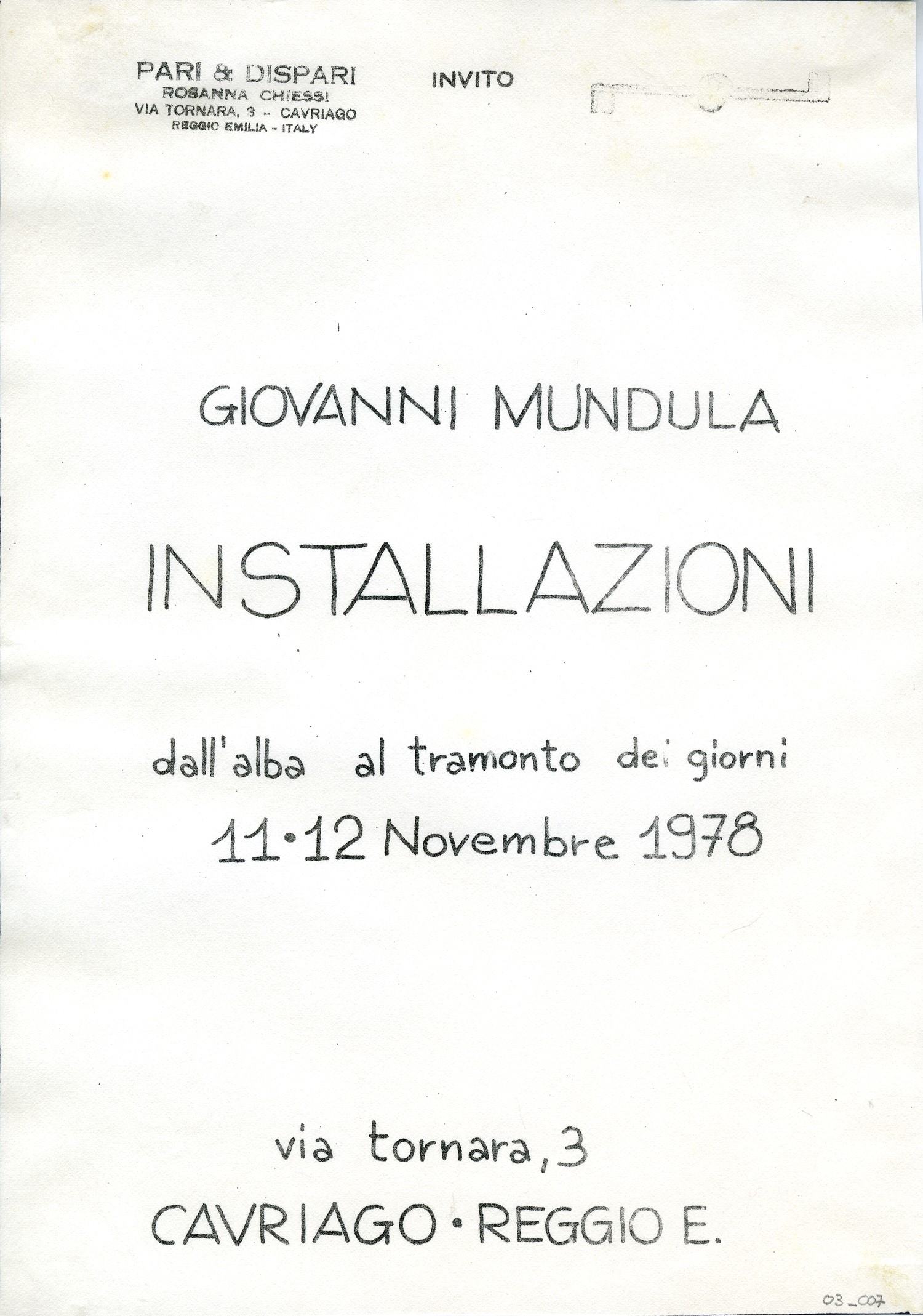 La collaborazione tra Giovanni Mundula e Rosanna Chiessi inizia nel 1978 con la partecipazione dell’artista al Festival Performance Musica e Poesia che si svolge a Cavriago (Re) il 1 giugno. L’artista crea un’installazione nella porcilaia vicina all’abitazione sede degli eventi organizzati da Pari&Dispari, in via Tornara a Cavriago.