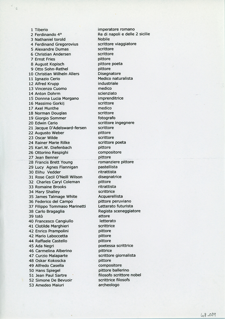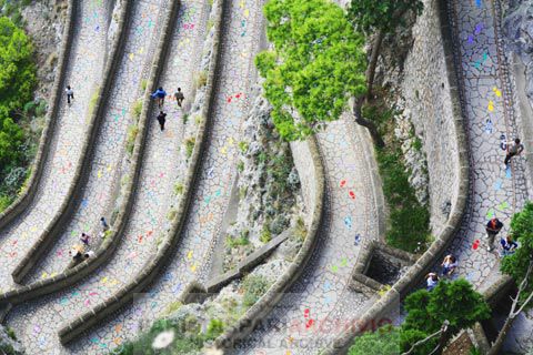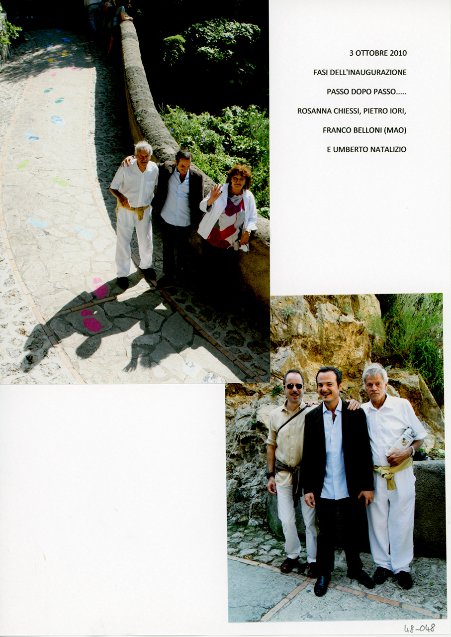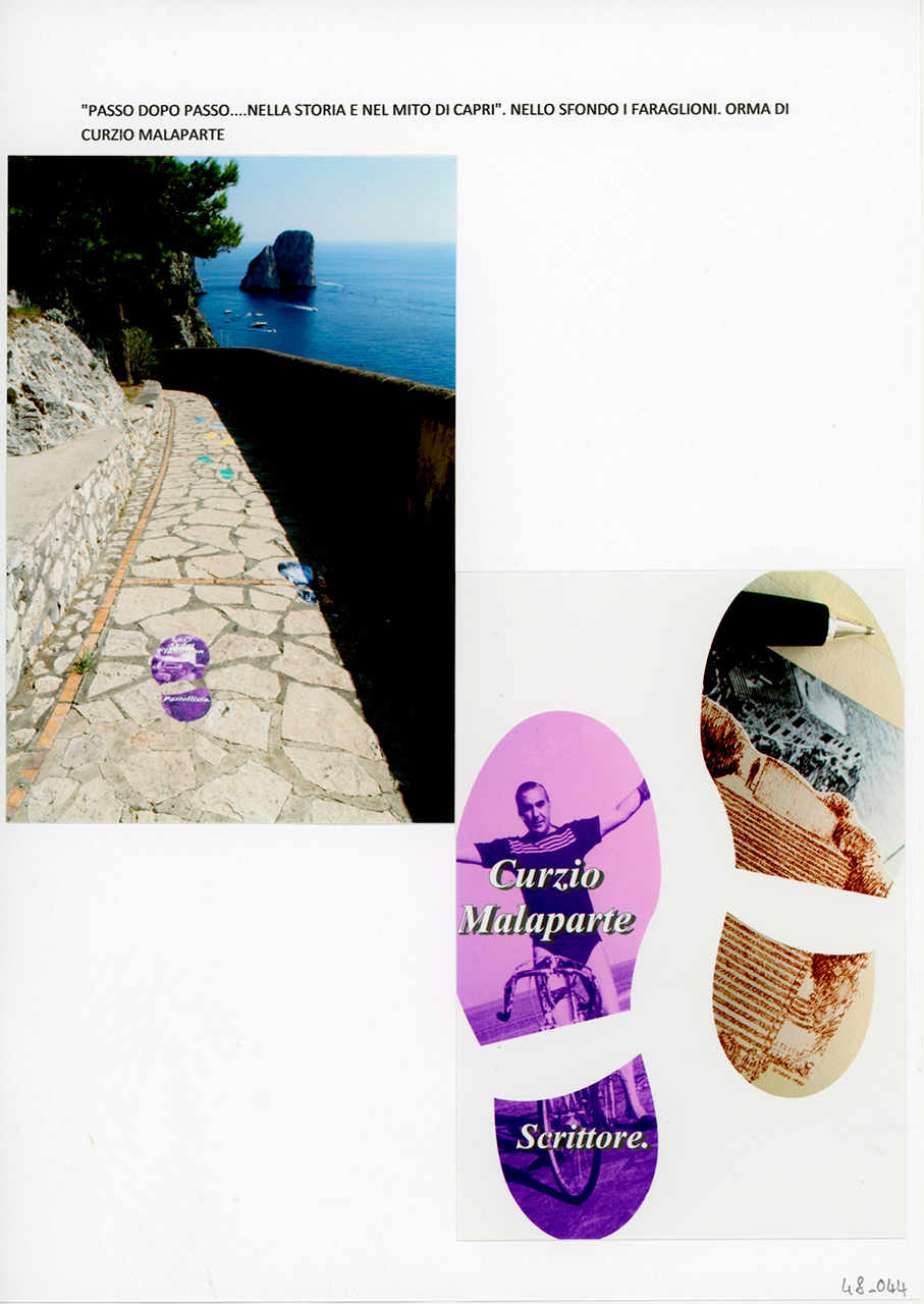 Il serpentone tagliato nella roccia, che il magnate tedesco Alfred Krupp donò all’isola di Capri è diventata da domenica la strada più attraversata dell’isola, dove turisti, vacanzieri ed isolani si recano per ammirare l’installazione artistica “Passo dopo passo …nella storia e nel mito di Capri”. Lungo mille metri di strada, l’artista Pietro Iori ha istallato ben centosei orme che rappresentano le impronte lasciate nel corso dei secoli da dandy, viaggiatori, artisti, scrittori, musicisti e mecenati che hanno scelto l’isola a loro dimora o luogo dell’anima. Apripista è Tiberio, l’imperatore che da Capri governò il mondo per ben 14 anni. Non potevano mancare le orme di Krupp, Gorkij, Axel Munthe e Neruda, sino ai contemporanei Liliana Cavani, Dudù La Capria, Roberto Ciuni, che diresse il Mattino negli anni ’70 ’80, Adriana di Fiore de La Parisienne, ed ovviamente Donna Lucia Morgano, la nume tutelare degli stranieri all’inizio del ‘900. L’installazione, che chiude la rassegna culturale Grand Tour si è avvalsa del patrocinio dell’Assessorato alla Cultura del Comune di Capri, ed è stata organizzata e promossa dall’Associazione Culturale caprese Antemussa di Annamaria Boniello e dall’Archivio Storico Pari e Dispari di Rosanna Chiessi. L’installazione resterà aperta fino ai giorni del Convegno di Confindustria, che avrà luogo nell’ultimo finesettimana di Ottobre 2010.