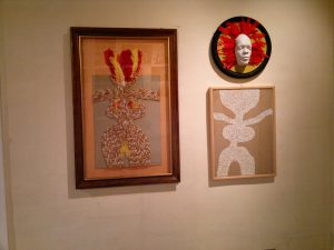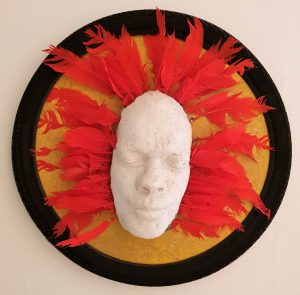 Al Hansen, Turbaco Colombia Fantom, opera unica, 1989, gesso, piume, legno dipinto, copertone da motorino, cm 50 diametro. Opera esposta nelle mostre   Women in Fluxus & Other Experimental Tales, 10 Novembre 2012 – 10 Febbraio 2013, Palazzo Magnani, Reggio Emilia