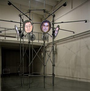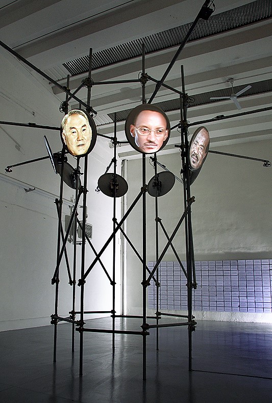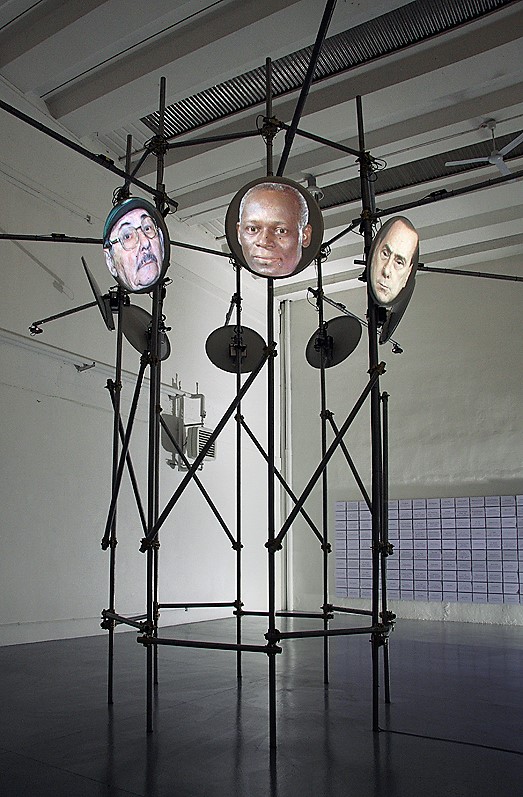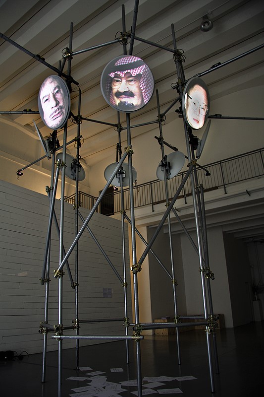 L’installazione ha come tema il “potere” in quanto tale e le relazioni che scaturiscono tra le forme di governo/dittatura e i movimenti di resistenza/liberazione in un contesto storico caratterizzato dalle tecnologie della comunicazione e dal capitalismo cognitivo. Otto paraboli satellitari montate sugli angoli superiori di un traliccio alto 6 metri di forma ottagonale, fungono da superficie di proiezione per otto canali video/audio tra loro sincronizzati. Le proiezioni mostrano in una prima successione di tre sequenze composte ciascuna da otto personaggi complessivamente 24 “dittatori” contemporanei (ognuno su una parabola), di cui due eletti in paesi a regime democratico parlamentare. I dittatori citano uno dopo l’altro ventiquattro aforismi del “principe” del Machiavelli, inscenando così una specie di una surreale conferenza (in inglese). In aggiunta alla terza sequenza compare una quarta finale che mostra contemporaneamente su tutte le paraboli immagini drammatiche della primavera araba riprese perlopiù con telefonini dai dimostranti stessi. L’ultima sequenza video finisce con l’immagine della morte di Gheddafi. L’installazione è un’opera recente proprietà dell’artista.