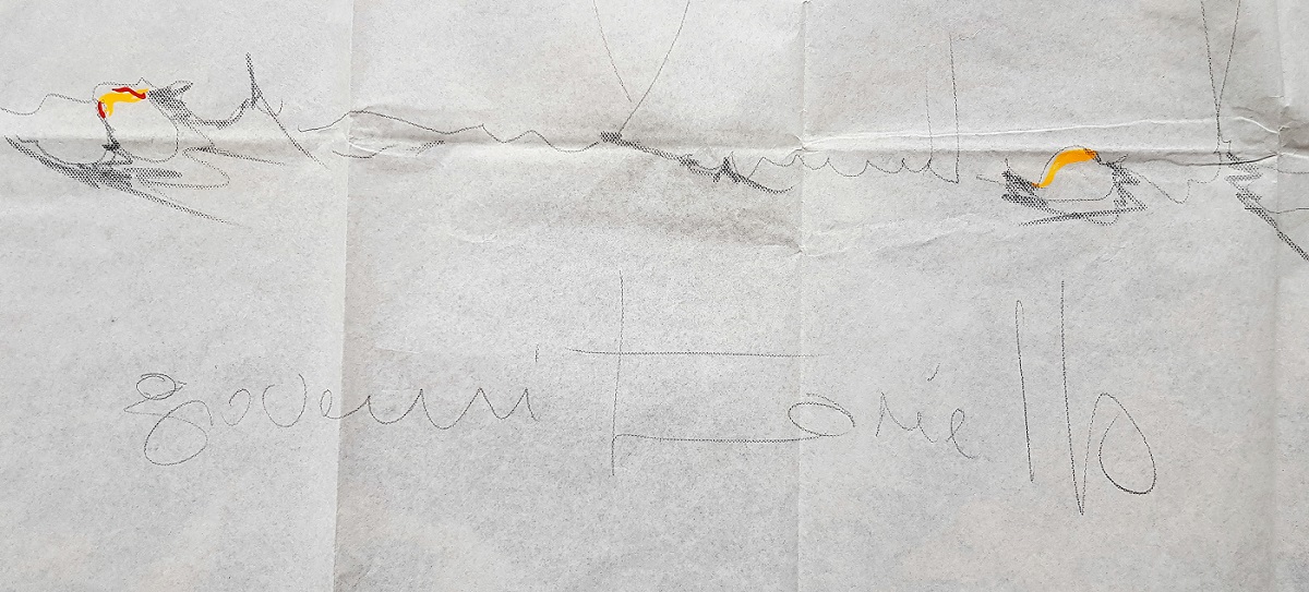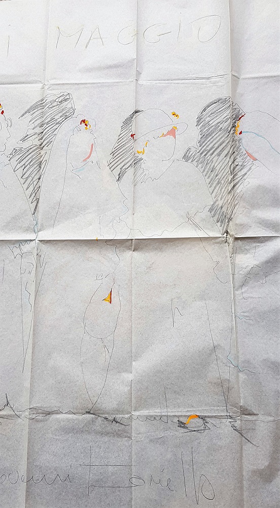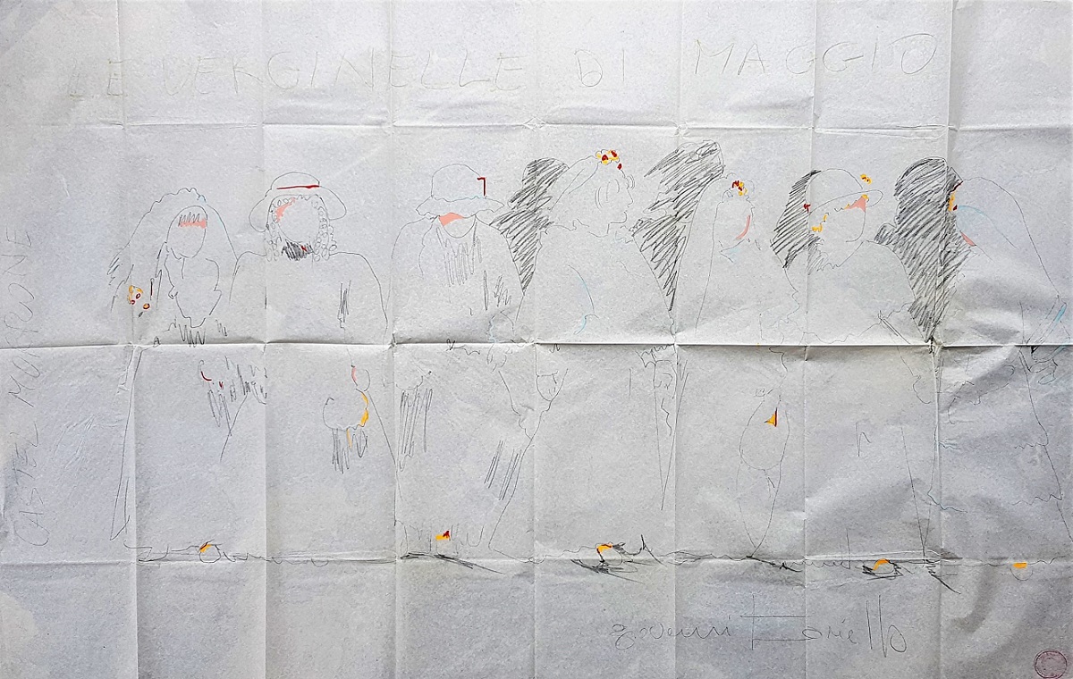 14 Febbraio 2022 Giovanni Tariello, Le verginelle di maggio Giovanni Tariello, Le verginelle di maggio/Castel Morrone, opera unica, anni’80, disegno su carta con interventi acrilici, cm 100 x 150. Timbro e firma in basso a destra.