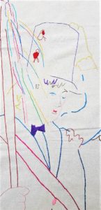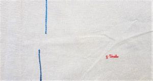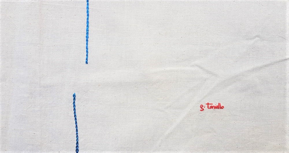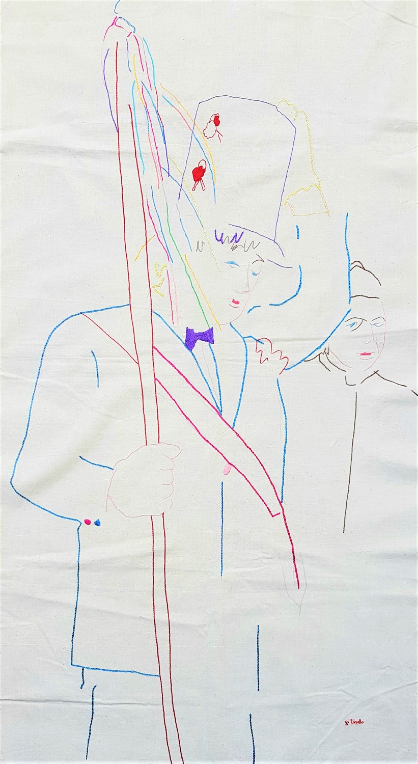 Giuseppe Tariello, Figura maschile con donna, opera unica, senza data anni ’80, cm 139 x75. Opera realizzata con linee ricamate su stoffa, firmato in basso a destra.