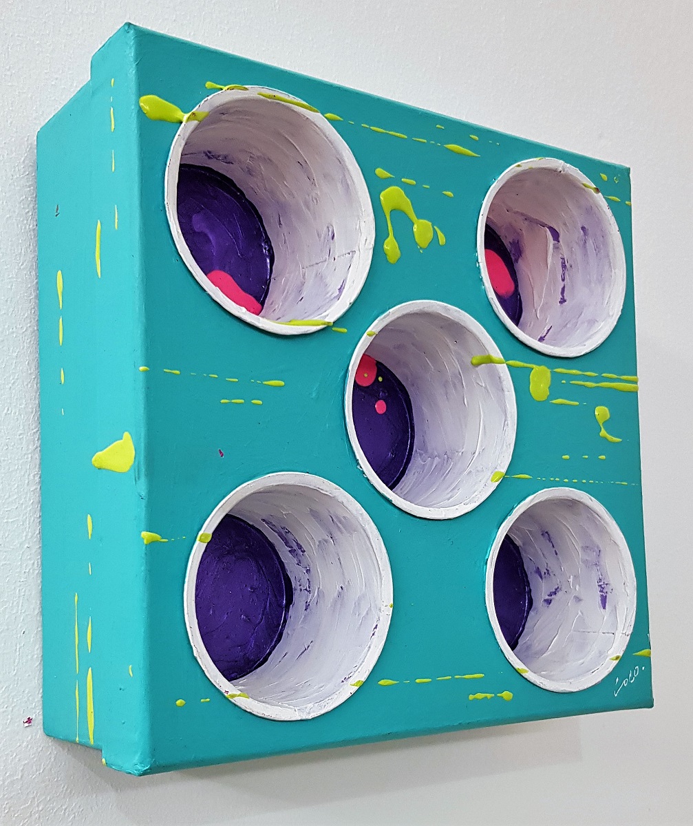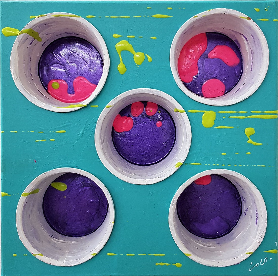 7 Ottobre 2019 LOCO, Cup box azzurro LOCO, Cup box azzurro, 2008, acrilico, bicchieri in plastica e scatola, cm 20 x 20. Scatola in cartone con bicchieri di plastica infilati e dipinti.