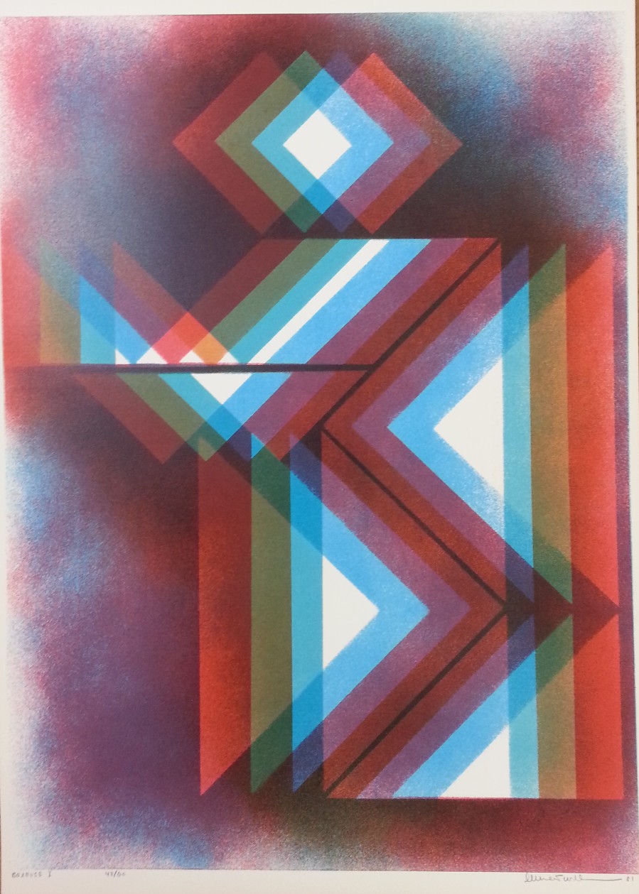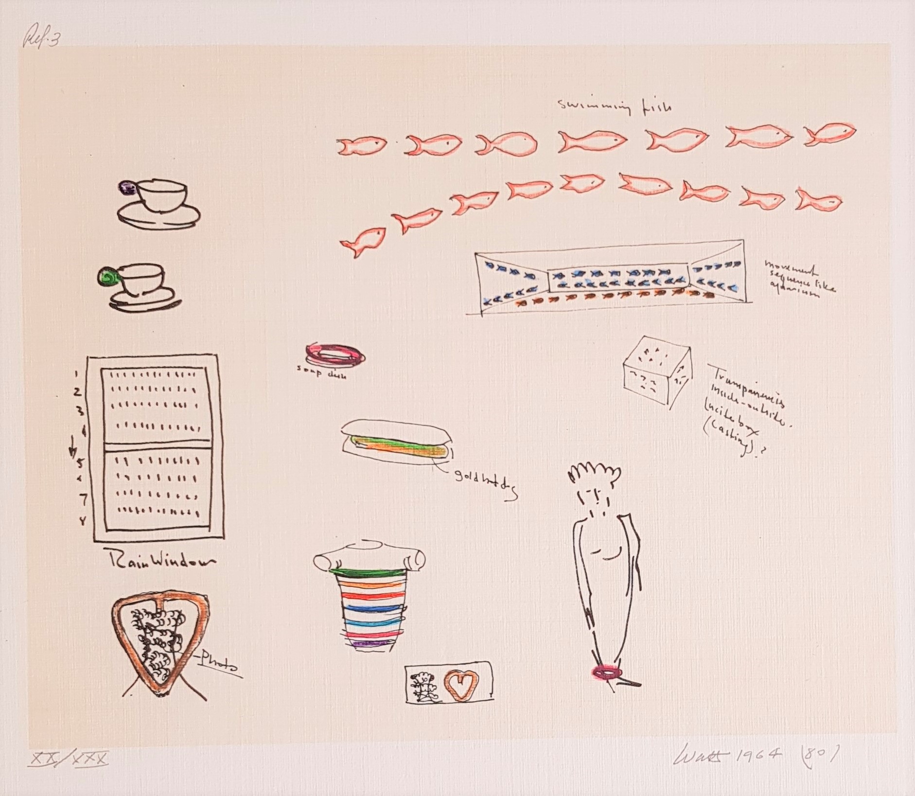 Bob Watts, Progetti, anni ’60/1980, edizione Pari&Dispari, stampe a colori ritoccate a mano, cm 50×35, tiratura 150. Ogni cartella contiene 20 serigrafie ritoccate a mano. Il progetto iniziale risale agli anni ’60, ristampato e ritoccato a mano nel 1980.