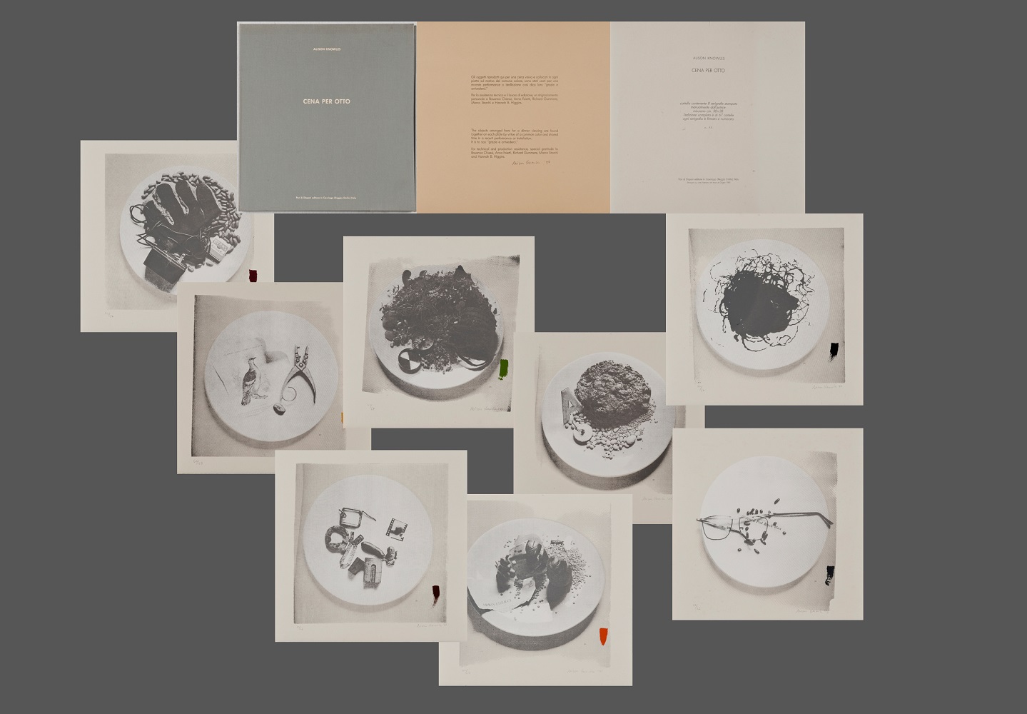 Alison Knowles, Cena per otto serigrafia, cm 38 x 38 x 1, 1985 Cartella con 8 serigrafie in bianco/nero con ritocco manuale di colore, stampata manualmente dall’artista. Tiratura 67 esemplari. Edizione Pari&Dispari